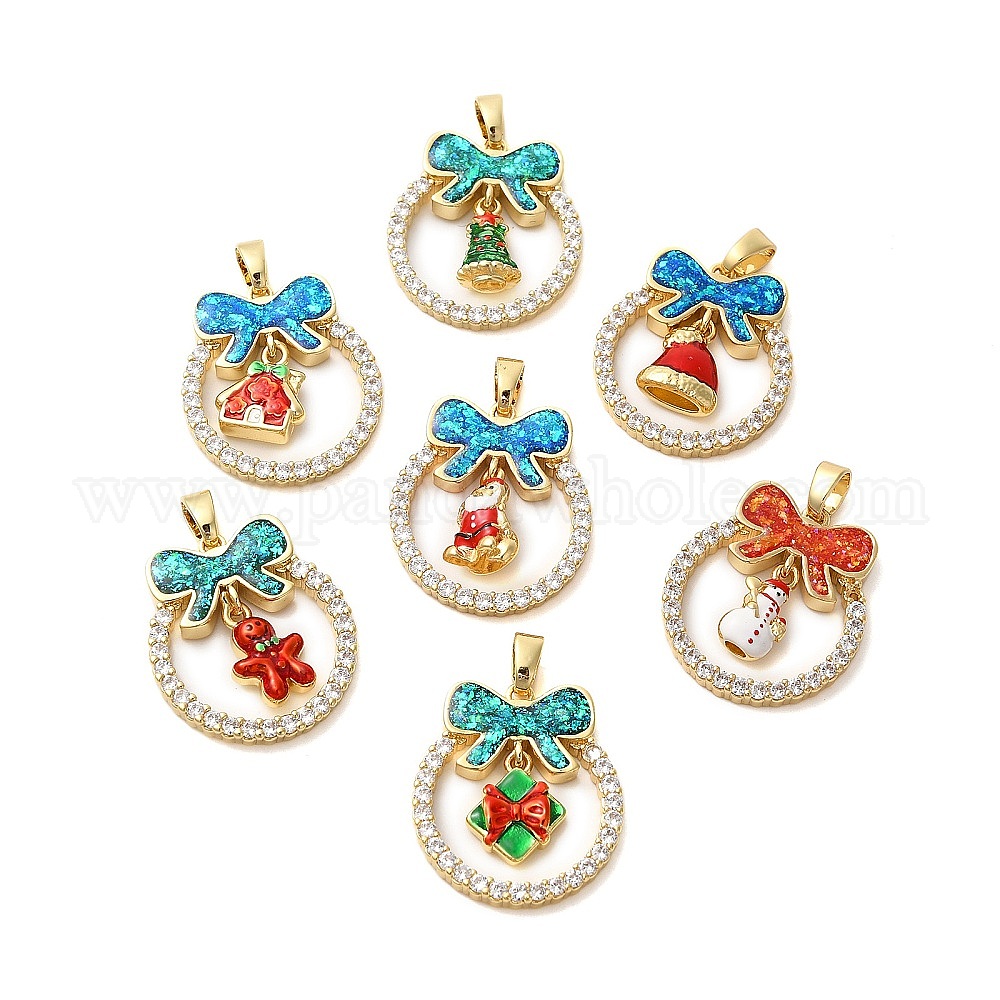 Рождественские тематические латунные подвески с микропаве и кубическим цирконием, с эмалью и синтетическим опалом, долговечный, без свинца и без кадмия, реальный 18 k позолоченный, кольцо с бантом
