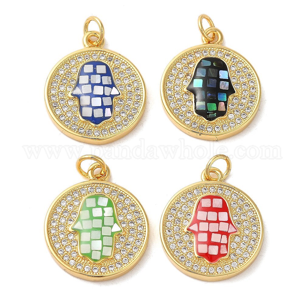 Плоские круглые подвески из латуни с фианитом и хамсой, с эмалью и ракушкой, долговечный, без свинца и без кадмия, реальный 18 k позолоченный, с прыжковых колец