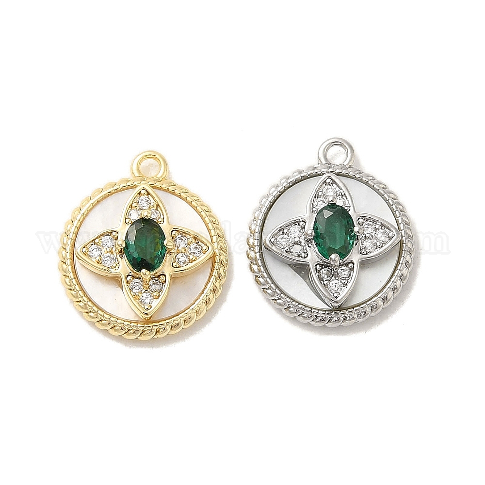 Латунные микропаве прозрачные кубические циркониевые подвески, без кадмия, без никеля и без свинца, со стеклом, ракушкой и кольцом для прыжков, плоские круглые с цветком