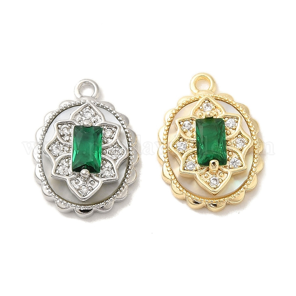 Латунные микропаве прозрачные подвески с фианитом, без кадмия, без никеля и без свинца, со стеклом, ракушкой и кольцом для прыжков, овальные с цветком (02XCRN)