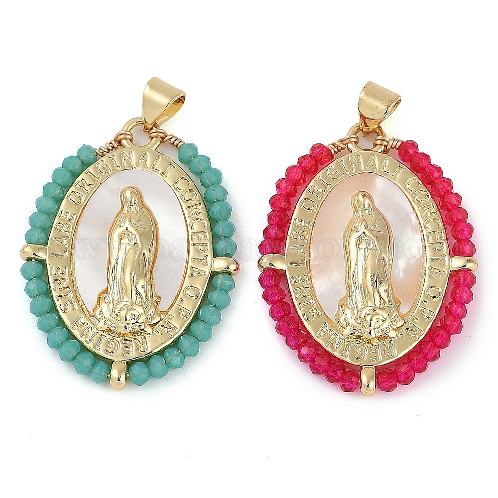 • Малиновый Латунные микро проложить кубического циркония подвески, с оболочкой, долговечный, без свинца и без кадмия, реальный 18 k позолоченный, овальные с рисунками " virgin mary", малиновый, 31.5x23.5x4 мм, отверстие : 4x3 мм
