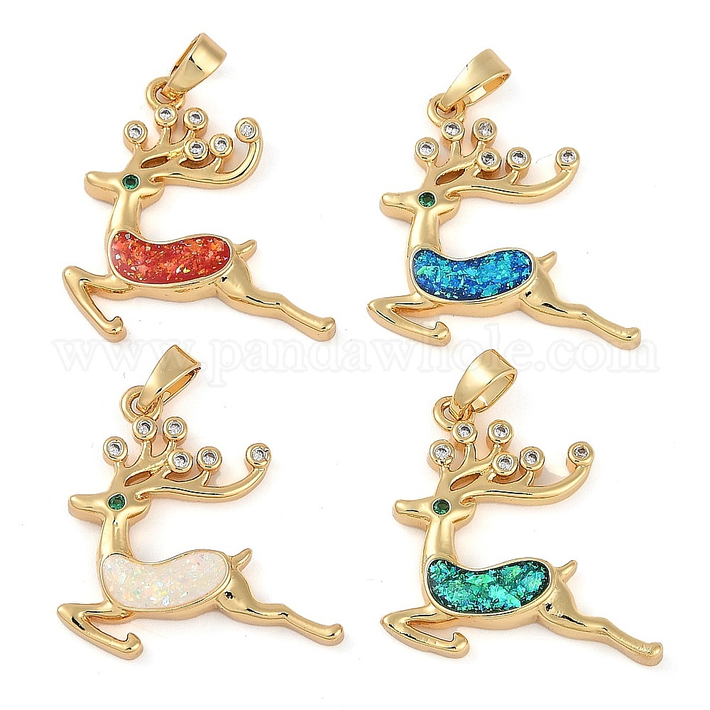 Подвески из латуни с микропаве из кубического циркония на тему честмас, с синтетическим опалом, долговечный, без свинца и без кадмия, лось