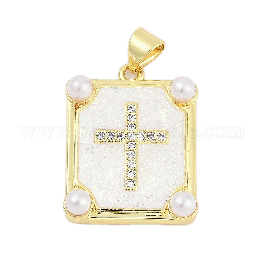 Латунные микропаве прозрачные подвески с фианитом, прямоугольник с крестом, с синтетическим опалом и искусственным жемчугом из АБС-пластика, долговечный, стойки покрытие, без свинца и без кадмия