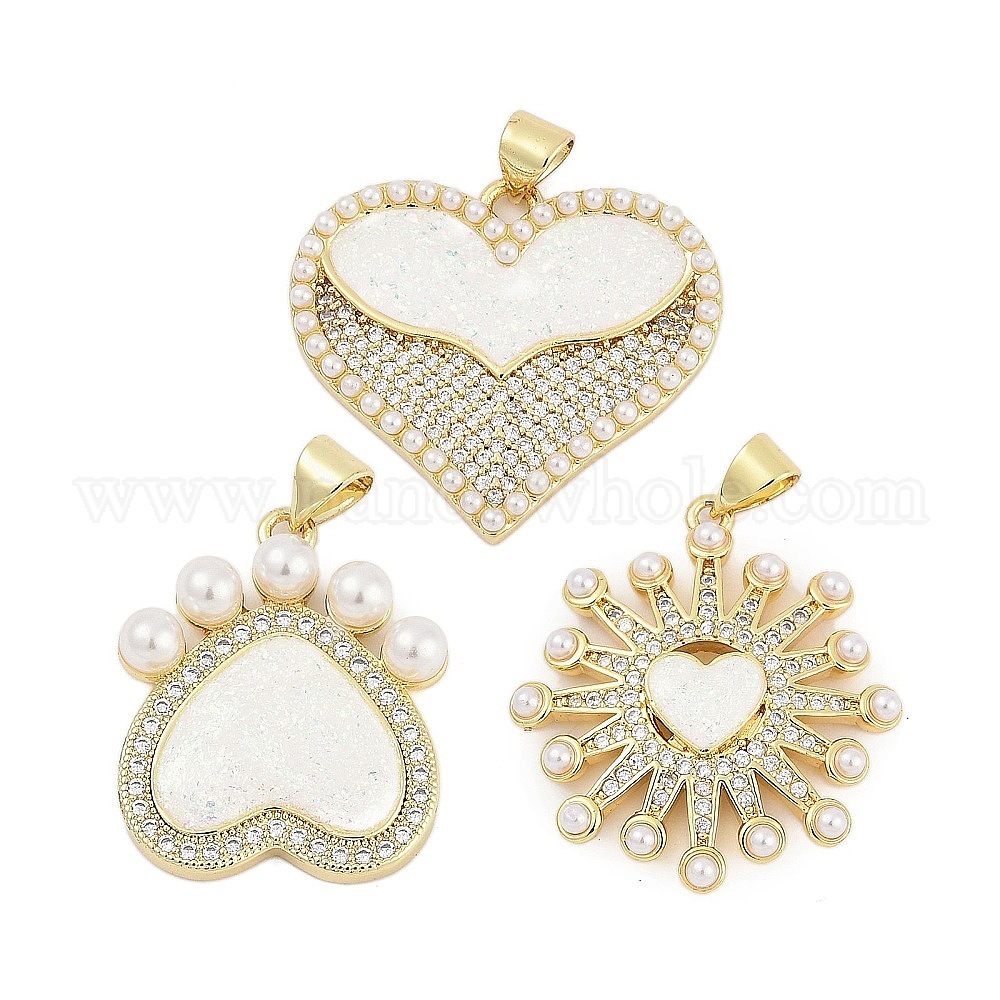 Латунные микропаве прозрачные подвески с фианитом, сердце, с синтетическим опалом и искусственным жемчугом из АБС-пластика, долговечный, стойки покрытие, без свинца и без кадмия