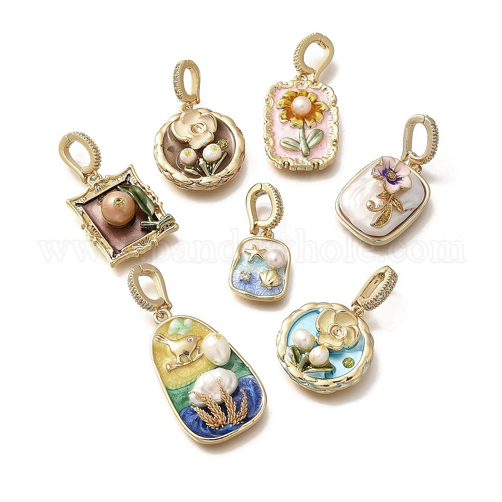 Подвески из латуни с микропаве из циркония, с эмалью и натуральным жемчугом, реальный 18 k позолоченный, стойки покрытие, без свинца и без кадмия (02ZQW5)