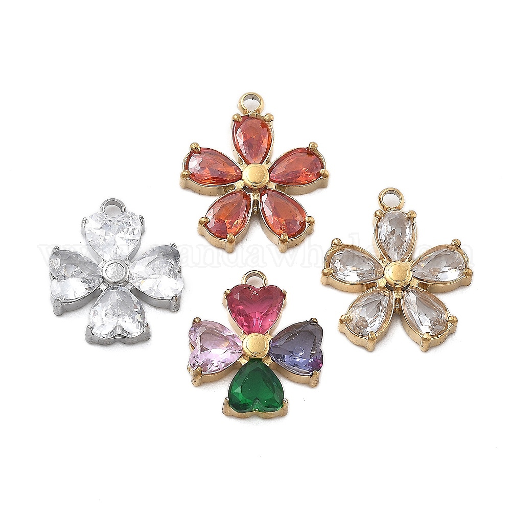 304 подвески из микро-паве из нержавеющей стали с фианитами, цветок, ионное покрытие (ip)
