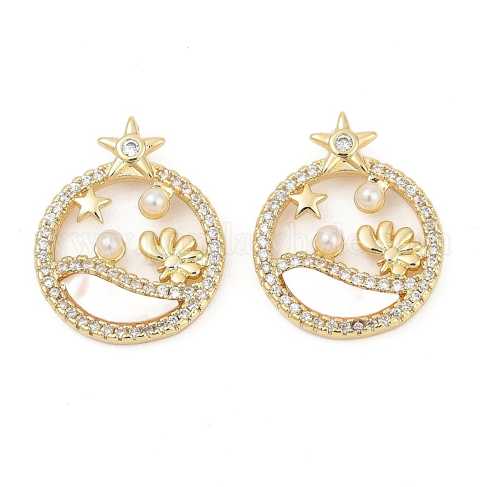 Латунные микро проложить кубического циркония подвески, с ракушкой и жемчужиной из АБС-пластика, плоские круглые прелести, без кадмия и без свинца, долговечный, стойки покрытие