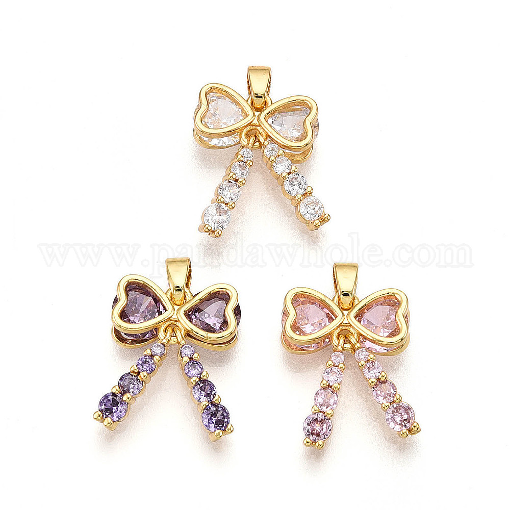 • Pink Латунные микро проложить кубического циркония подвески, без кадмия и без свинца, бантом прелести, реальный 18 k позолоченный, розовые, 17.5x13x4.5 мм, отверстие : 5x2.5 мм