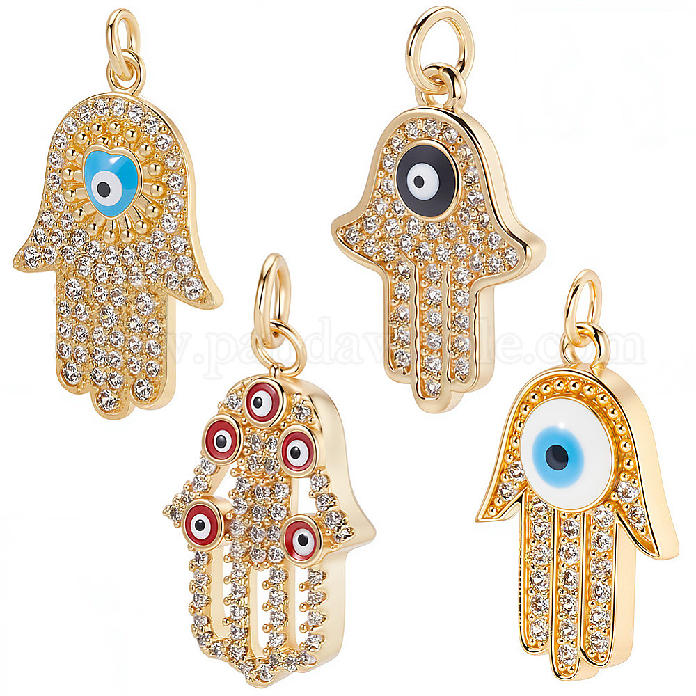 8 шт 4 стили латунные подвески из микропаве с фианитом, с эмалью, реальный 18 k позолоченный, с целью перехода в кольце, Хамса руку с дурным глазом (0326JG)