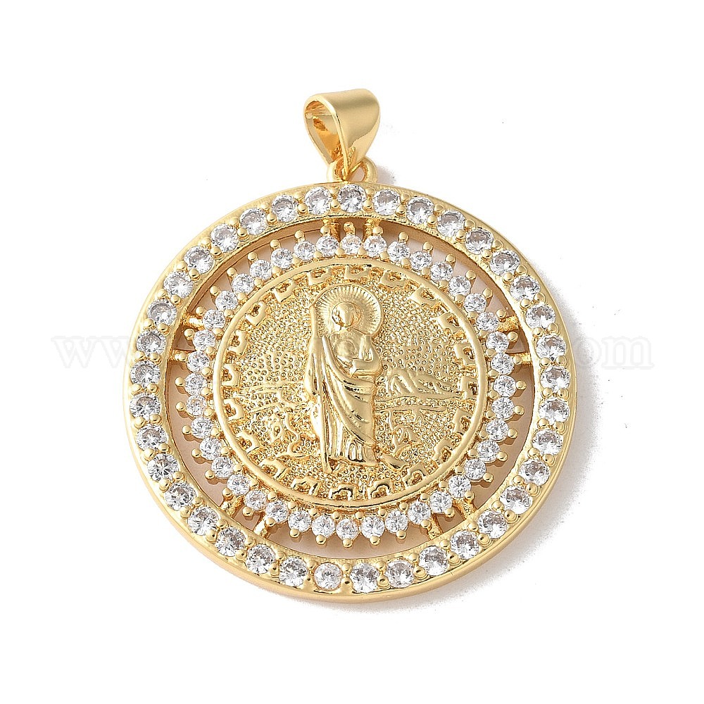 • Настоящее золото 18K Латунные микропаве прозрачные подвески с фианитом, плоские круглые с святым Бенедиктом, без кадмия и без свинца, реальный 18 k позолоченный, 32x30x4 мм, отверстие : 4.5x3.5 мм