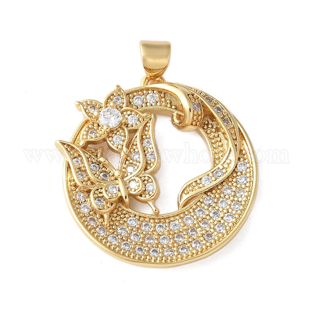 Латунные микро проложить кубического циркония подвески, Плоский круглый с бабочкой и цветком, долговечный, без кадмия и без свинца, стойки покрытие