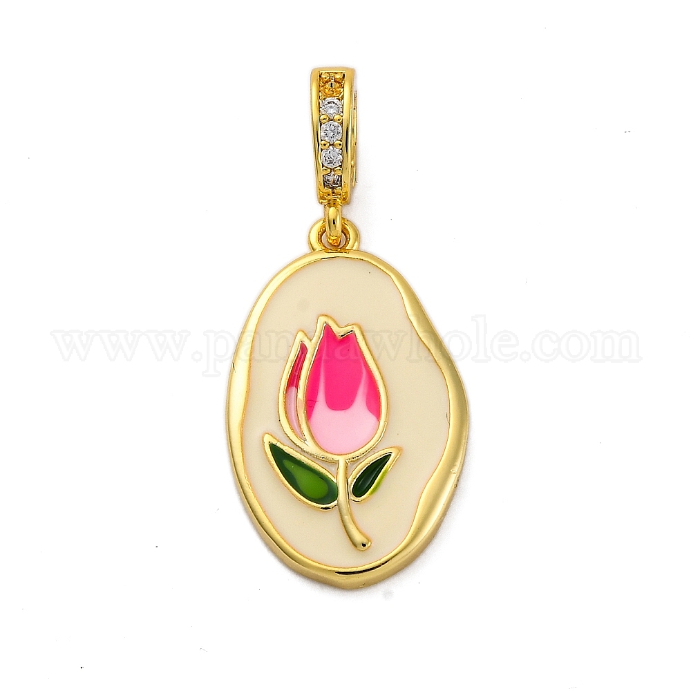 Латунные микро проложить кубического циркония подвески, с эмалью, овальные с цветком, долговечный, без кадмия и без свинца, стойки покрытие