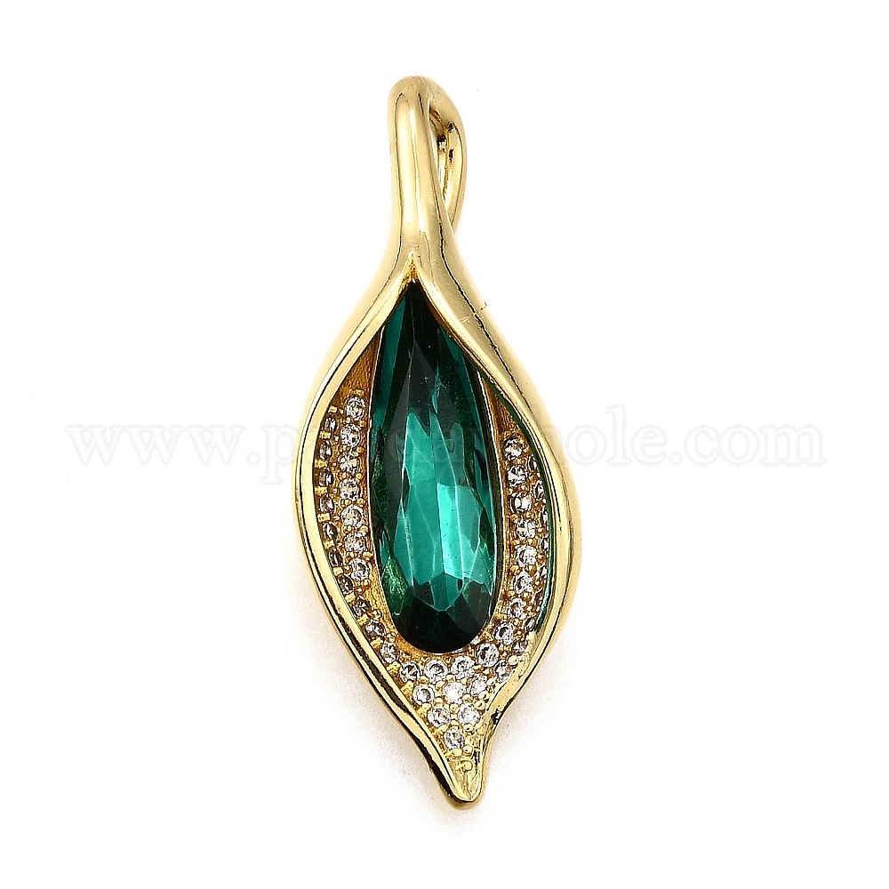 • Зеленый Стеклянные подвески, цветок, с реечной обшивкой из латуни микропаве с фурнитурой из фианита, без кадмия и без свинца, долговечный, реальный 18 k позолоченный, зелёные, 37.5x14x6.5 мм, отверстие : 8x4 мм