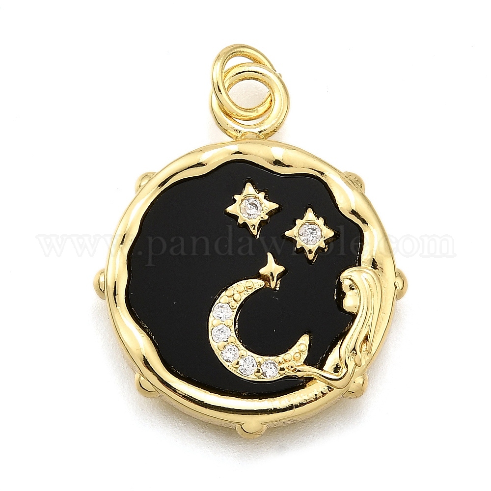 Латунные микро проложить кубического циркония подвески, Плоский круглый с луной и звездой, cmолой, стойки покрытие, долговечный, без свинца и без кадмия, с целью перехода в кольце