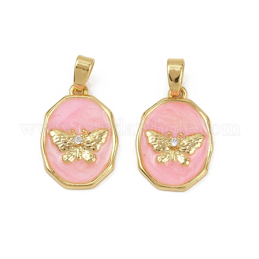Латунные микро проложить кубического циркония подвески, без кадмия и без свинца, с эмалью, овальные с бабочкой, реальный 18 k позолоченный