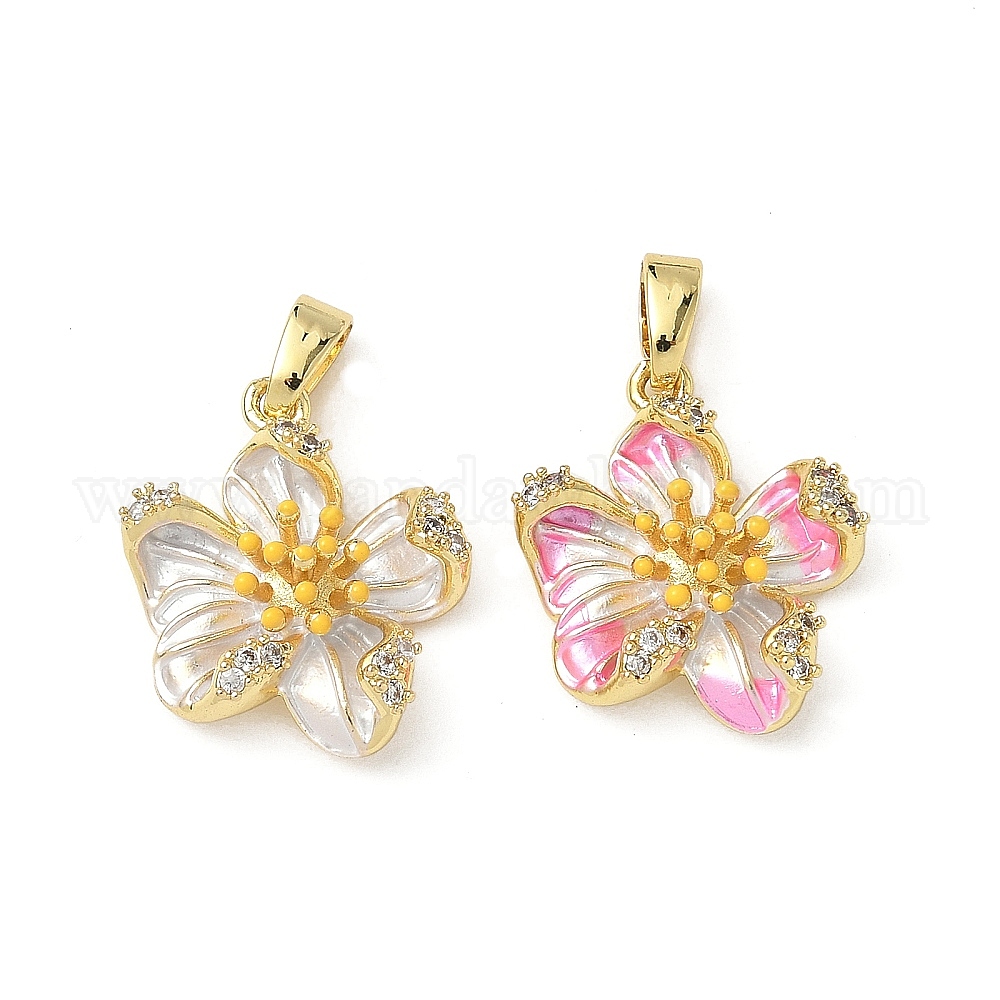 • Pink Латунные микро проложить кубического циркония подвески, с эмалью, цветок, реальный 18 k позолоченный, розовые, 16x15x5.5 мм, отверстие : 2.5x5 мм
