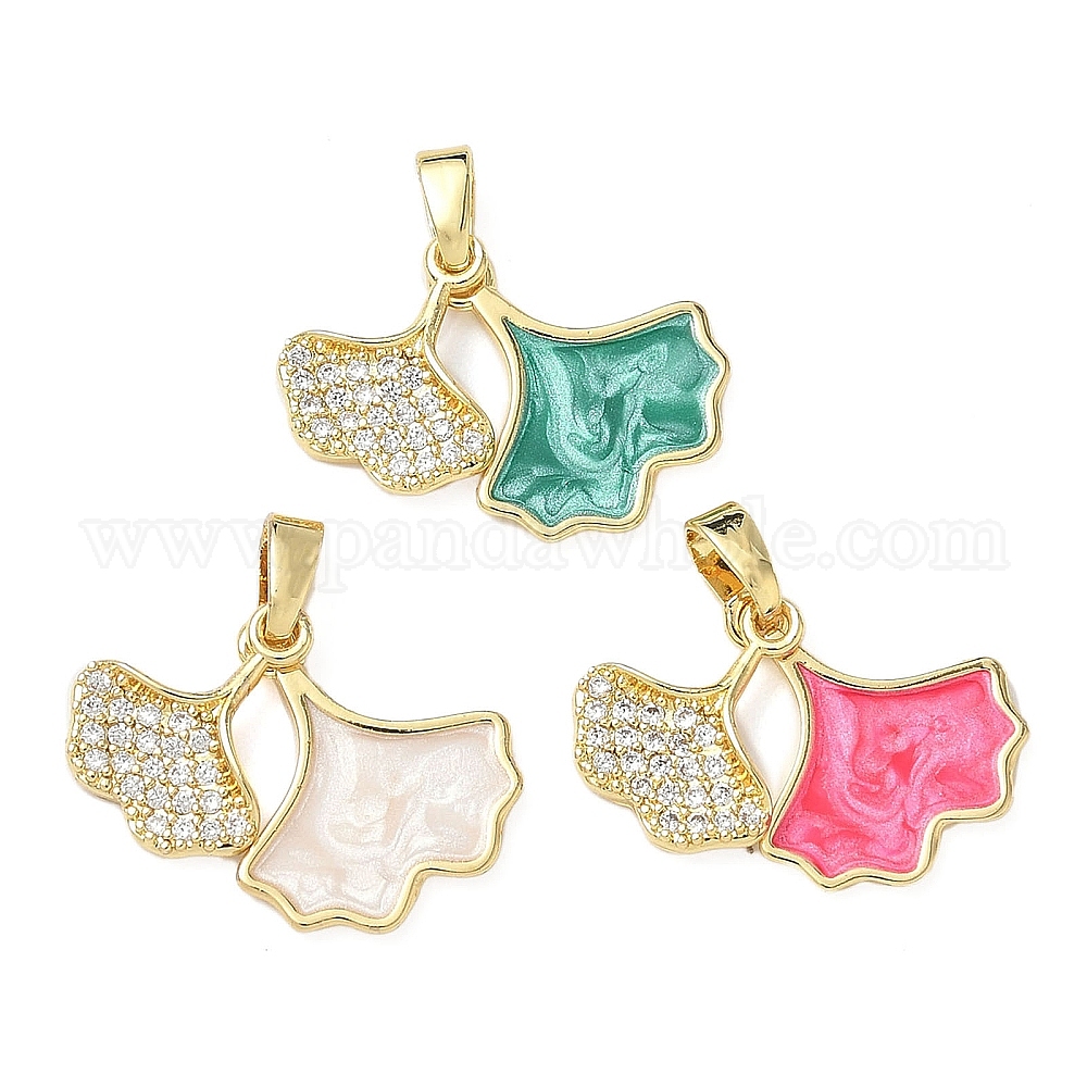 • Pink Латунные микро проложить кубического циркония подвески, с эмалью, гингко лист, розовые, 15.5x14.5x3 мм, отверстие : 2.5x4.5 мм
