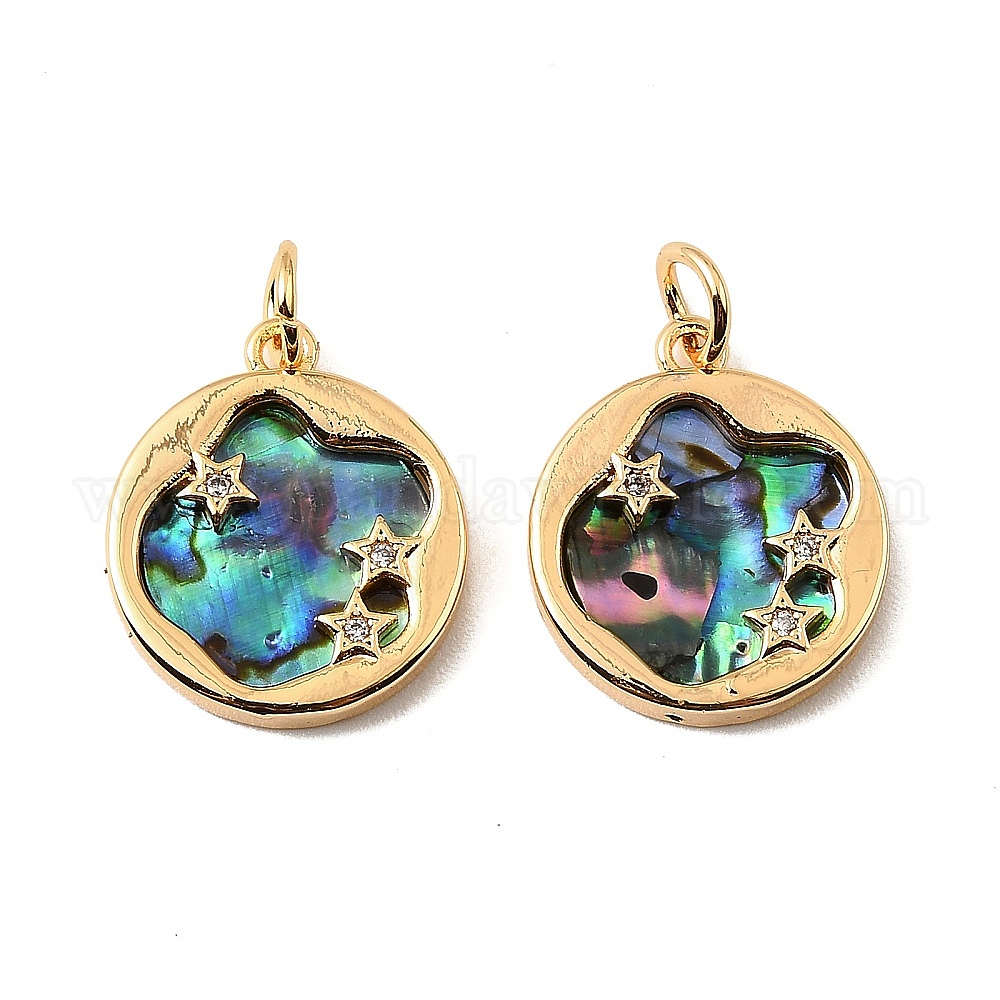 • Настоящее золото 18K Подвески из латуни, ракушек пауа и прозрачных кубических цирконий, плоские круглые подвески со звездным узором, с целью перехода в кольце, реальный 18 k позолоченный, 16.5x14x2.5 мм, отверстие : 3 мм