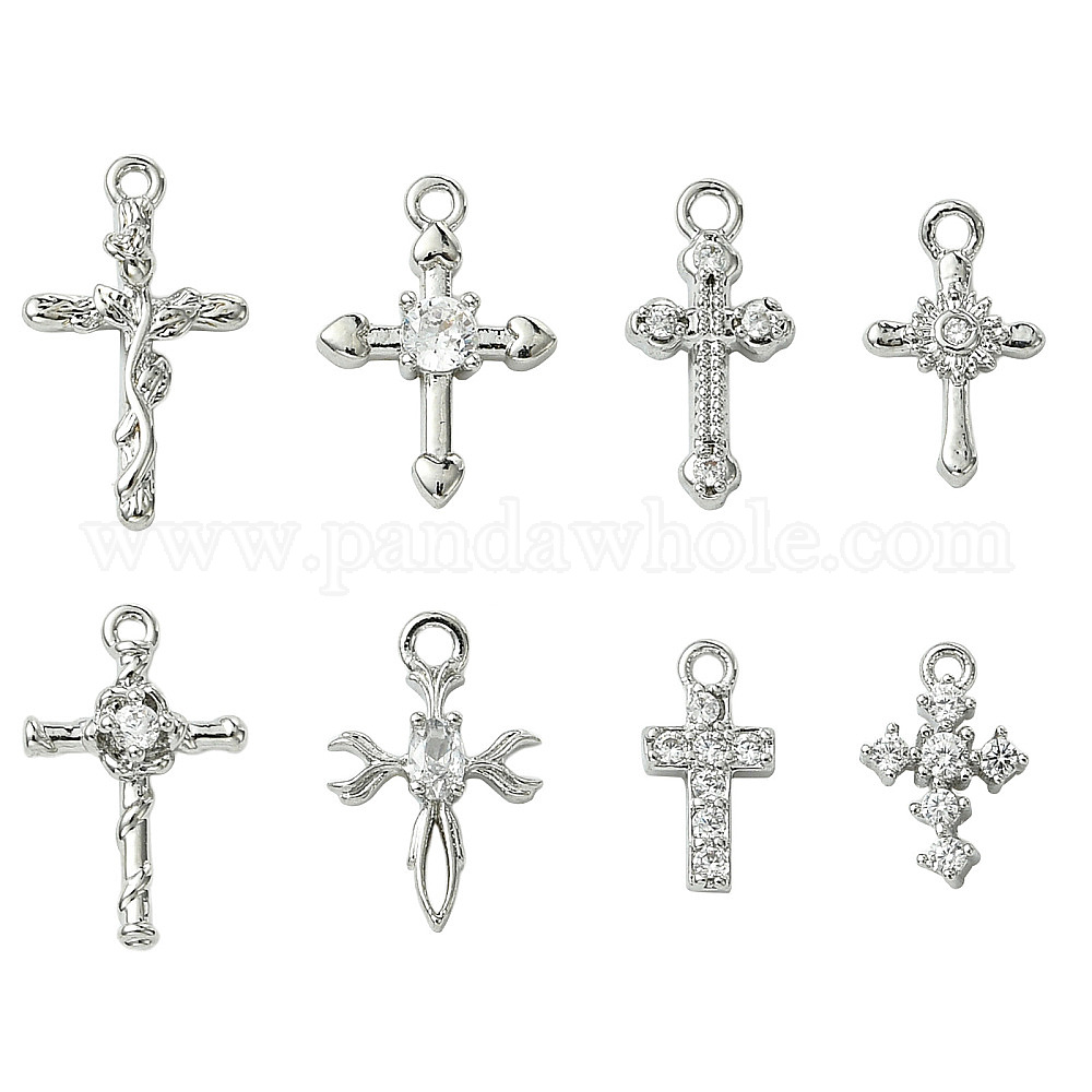 8 шт. 8 стили латунные микропаве прозрачные кубические циркониевые подвески, без кадмия, без никеля и без свинца, крестик