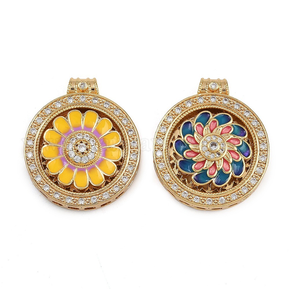 Вращающиеся подвески из латуни с микропаве из кубического циркония, Эмаль стиле, плоские круглые с цветком