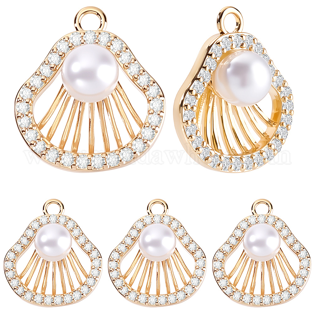 10шт. подвески из латуни с микропаве из прозрачных кубических цирконий и имитацией жемчуга из АБС-пластика, формы раковины, без никеля