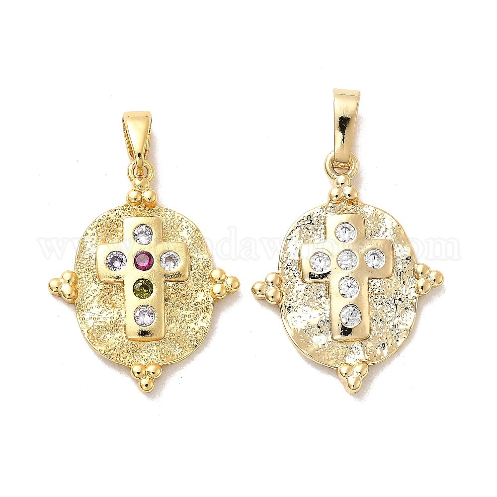 • Прозрачный Латунные микро проложить кубического циркония подвески, овальные с крестом, с кошачий глаз, долговечный, стойки покрытие, без свинца и без кадмия, реальный 18 k позолоченный, прозрачные, 23.5x18.5x2.5 мм, отверстие : 5.5x3.5 мм