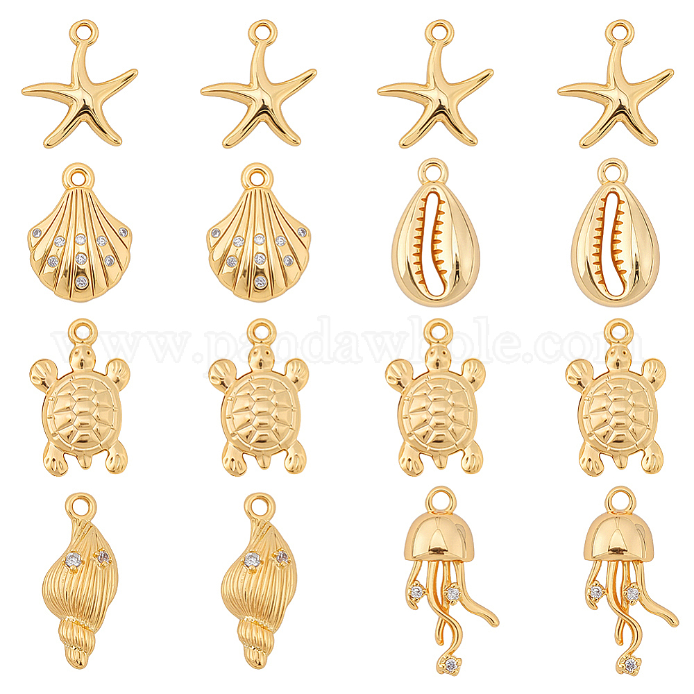 12шт. 6 стили, морская тематика, латунные подвески с микропаве из кубического циркония, долговечный, без никеля , реальный 18 k позолоченный