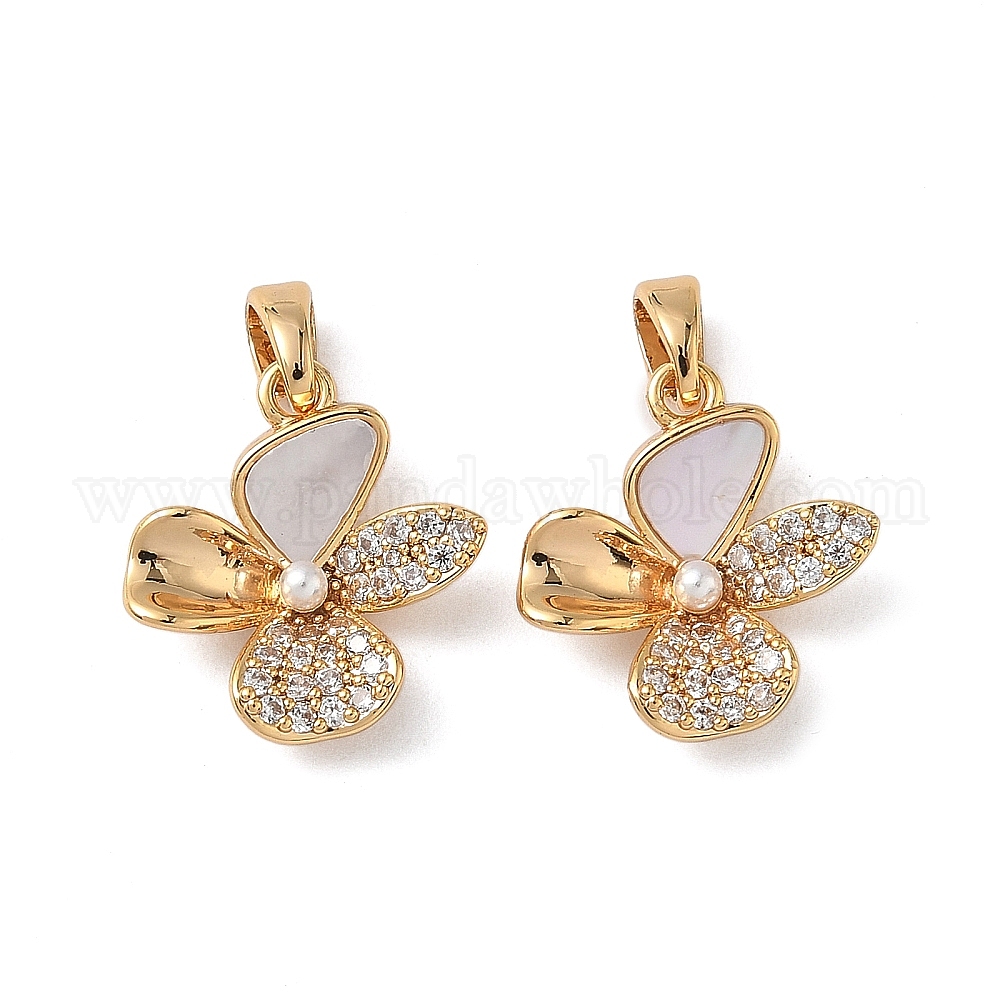 Латунные микро проложить кубического циркония подвески, цветок, с имитацией жемчуга и ракушки, без кадмия, без никеля и без свинца
