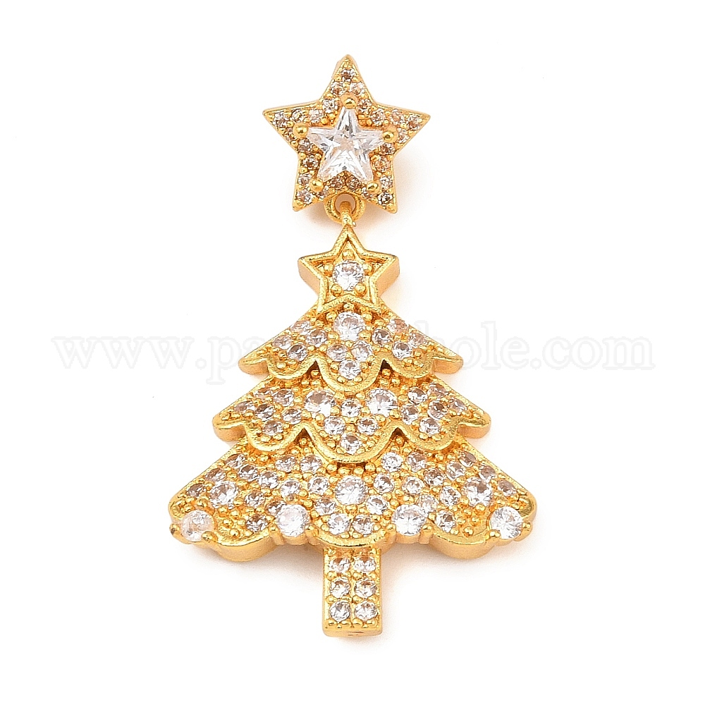 • Золотой Рождественские латунные подвески с микропаве из фианита, елочные прелести, золотые, 37.5 мм, Дерево: 28x22.5x4 мм, отверстие : 5.5x2.5 мм