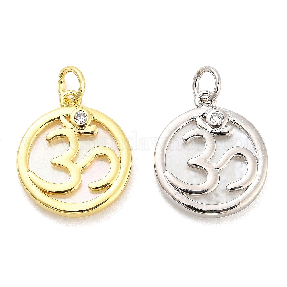 Латунные подвески из микропаве из циркония с раковиной, плоский круглый с символом ом, долговечный, стойки покрытие, без свинца и без кадмия, ионное покрытие (ip), с целью перехода в кольце