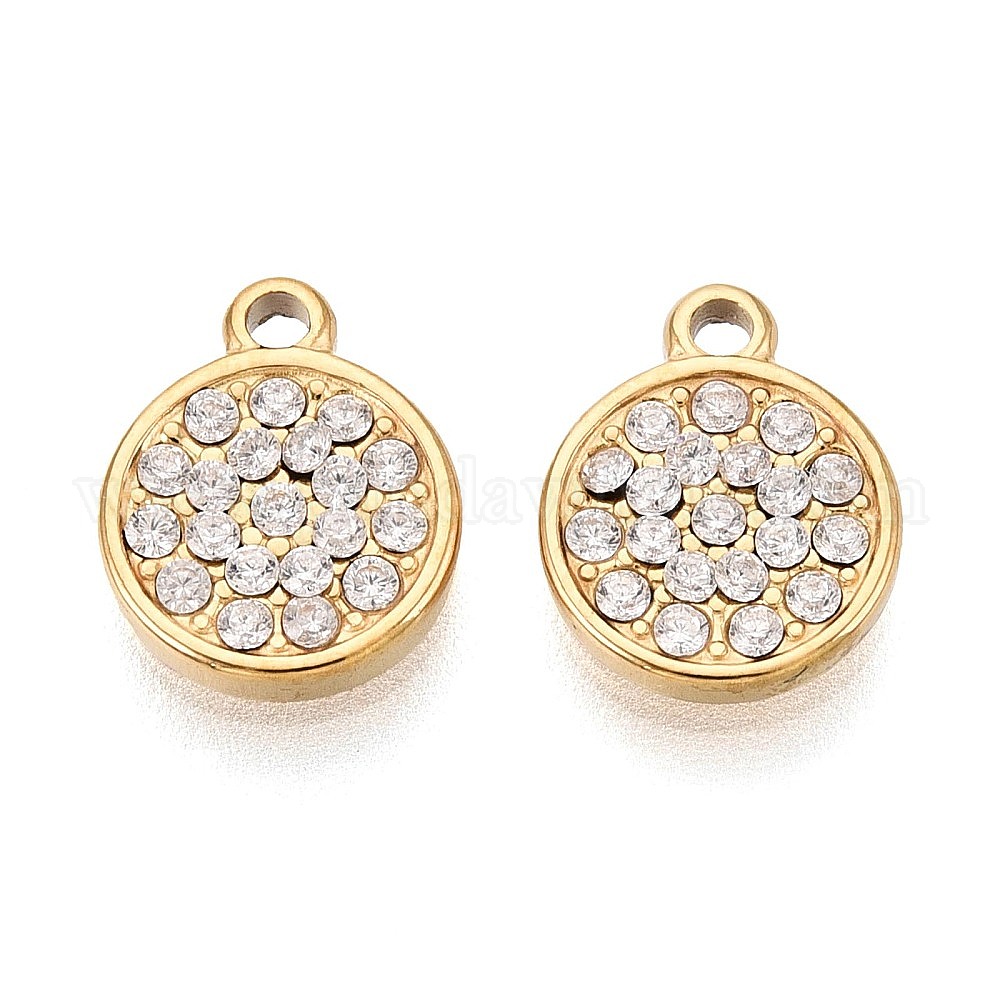• Настоящее золото 18K 304 подвески из микро-паве из нержавеющей стали с фианитами, плоские круглые прелести, ионное покрытие (ip), реальный 18 k позолоченный, 10x8x2 мм, отверстие : 1.2 мм