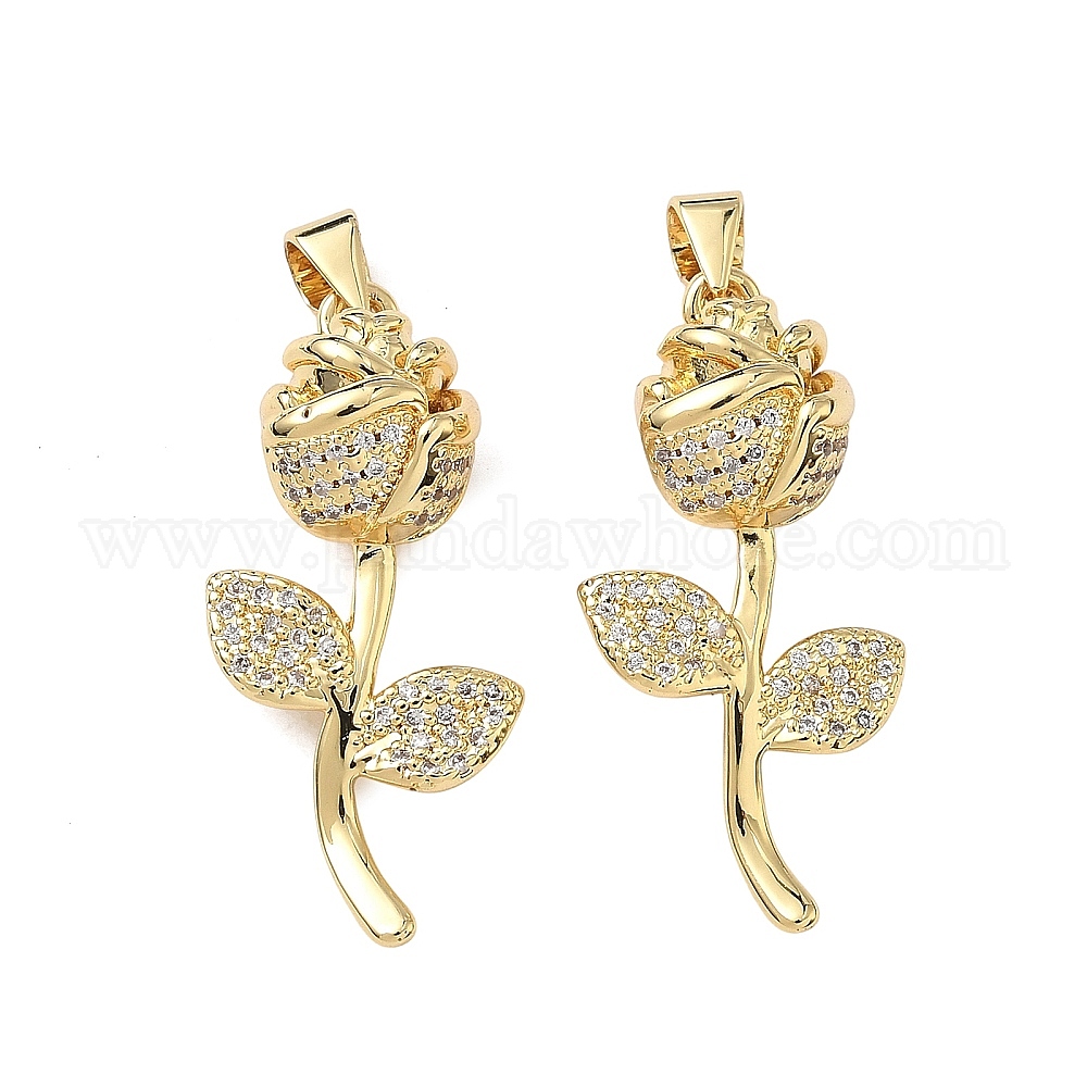 • Настоящее золото 14K Латунные микропаве прозрачные подвески с фианитом, прелести цветка розы, реальный 14 k позолоченный, 31x15x10 мм, отверстие : 4x3.5 мм