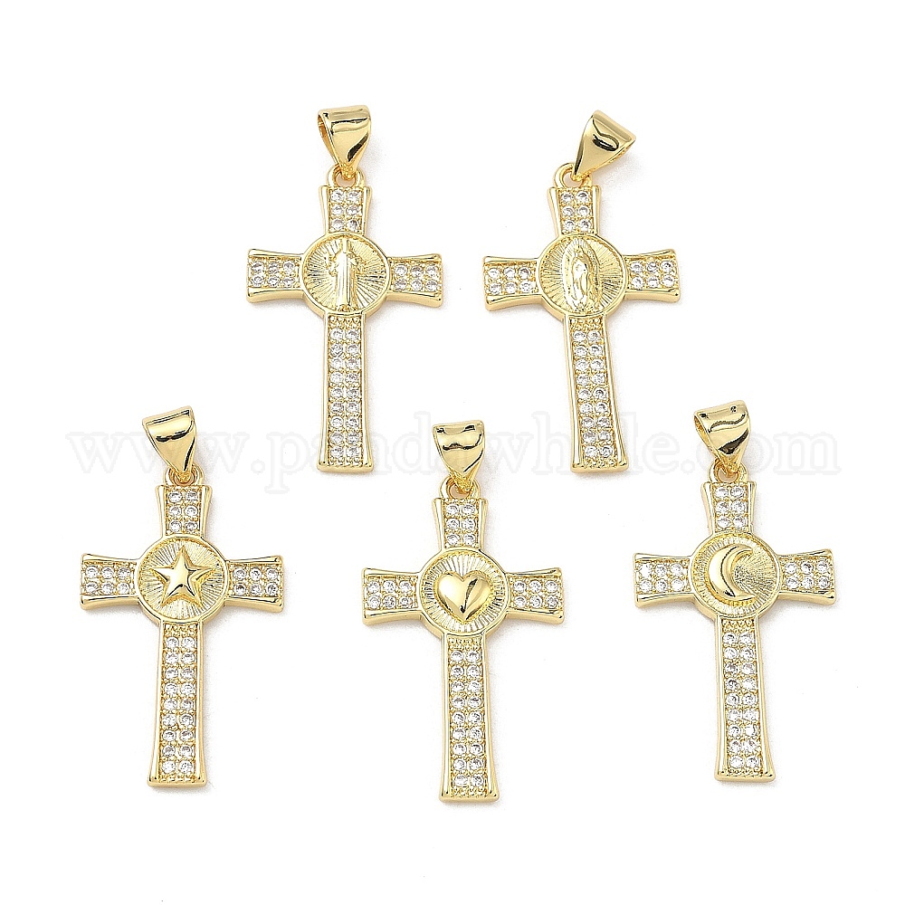 • Human Латунные микропаве прозрачные подвески с фианитом, крест прелести, реальный 16 k позолоченный, Дева Мария, 27.5x15.5x2.5 мм, отверстие : 4.5x3.5 мм