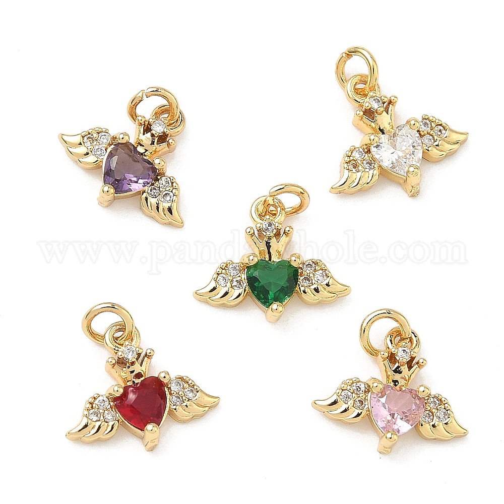• (52) Непрозрачная лаванда Латунные микро проложить кубического циркония подвески, подвески в виде сердца и крыльев, без свинца и без кадмия, стойки покрытие, долговечный, реальный 18 k позолоченный, разноцветные, 10x12x3 мм, Перейти кольцо: 4x0.8 мм, 2.5 мм внутренним диаметром