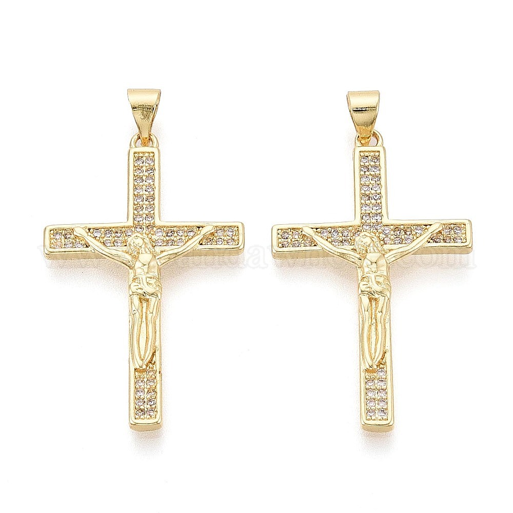 • Настоящее золото 16K Религиозные латунные подвески с микропаве из прозрачного кубического циркония, крест с подвесками Иисуса, реальный 16 k позолоченный, 34.5~35x21x3 мм, отверстие : 5x3.5 мм