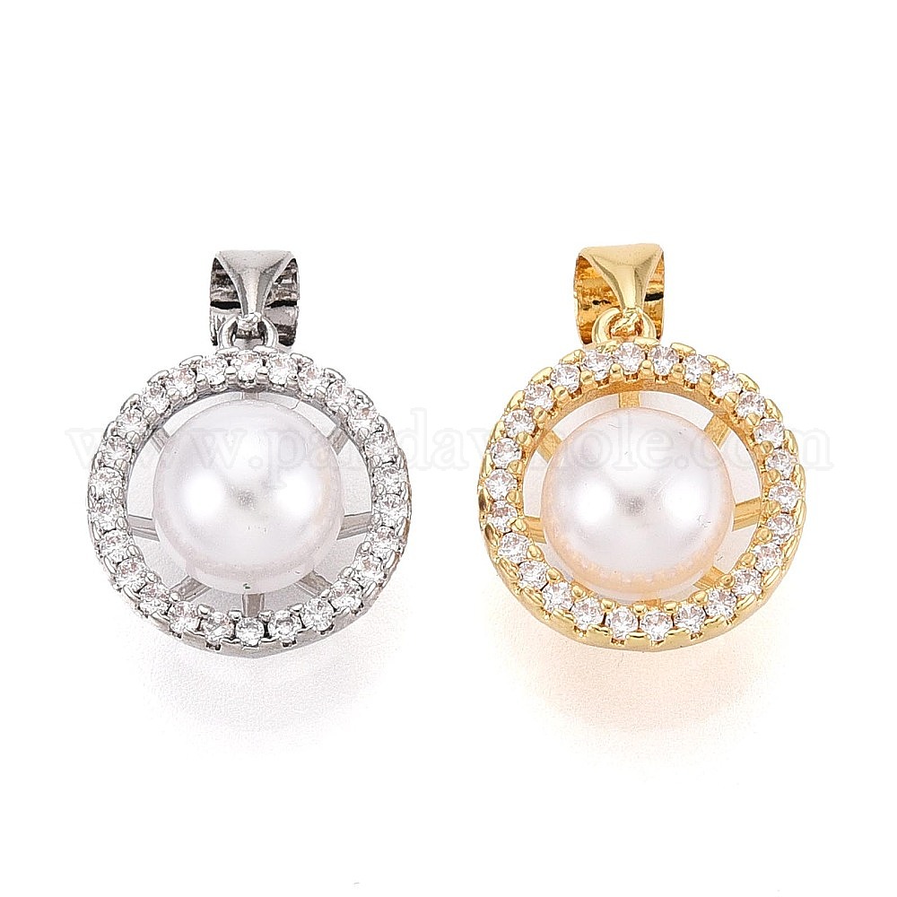 • Платина Латунные микропаве прозрачные подвески с фианитом, с имитацией жемчуга, полукруглые прелести, платина, 14.5~15x13x8.5 мм, отверстие : 5x3.2 мм