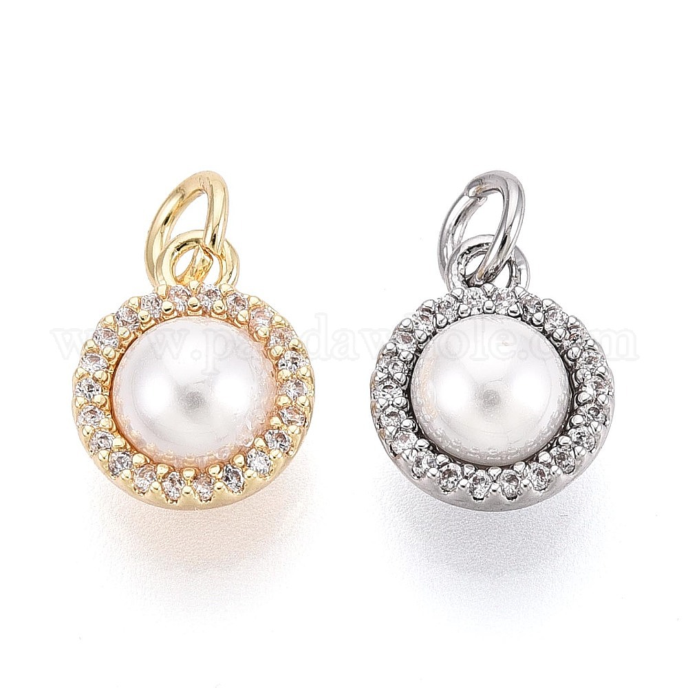 Латунные микропаве прозрачные кубические циркониевые подвески, с abs имитационными жемчужными бусинами , плоские круглые прелести