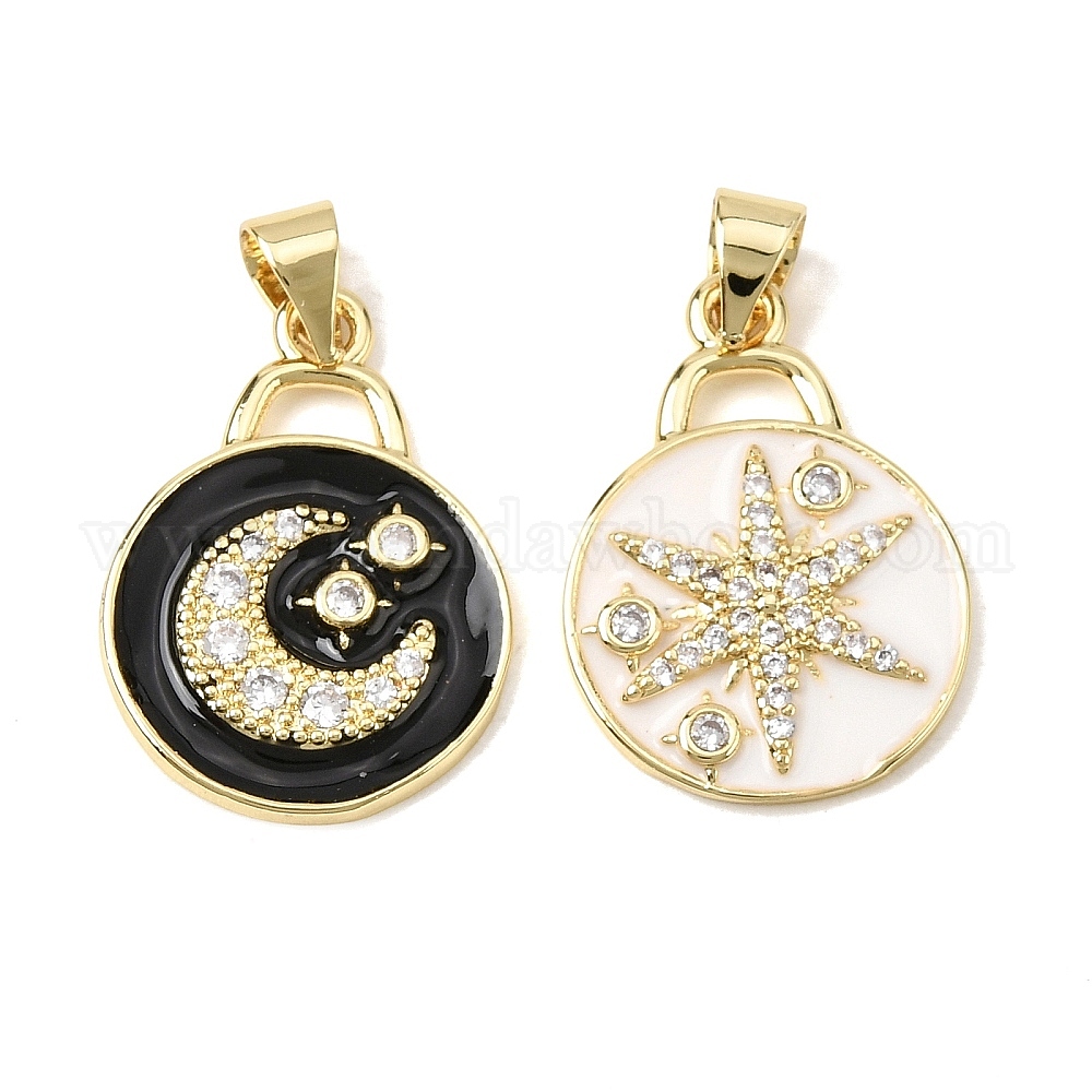 • Белый Латунные микропаве прозрачные подвески с фианитом, плоский круглый со звездными подвесками, долговечный, стойки покрытие, без свинца и без кадмия, с эмалью, реальный 18 k позолоченный, белые, 21x15x2.5 мм, отверстие : 3.5x3 мм