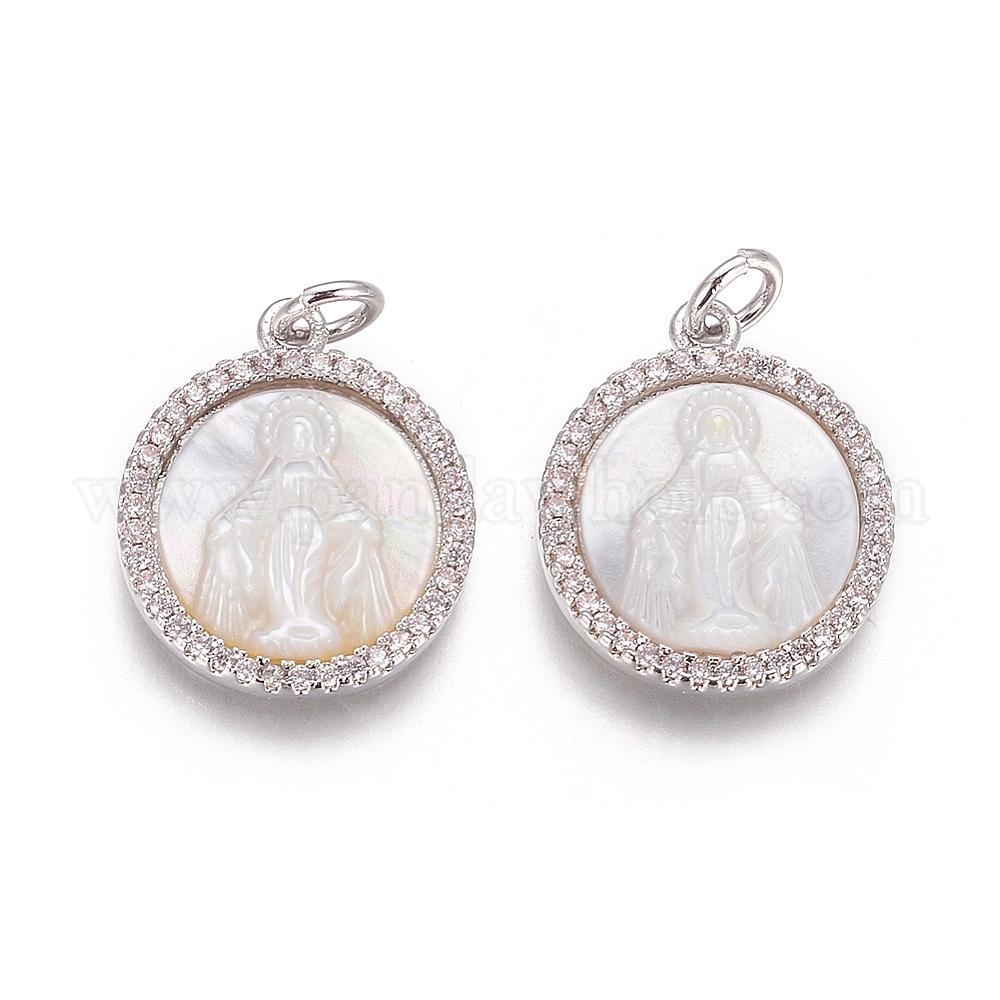 • Платина Латунные подвески, с микро проложить кубического циркония, раковины и прыжковые кольца, плоские круглые с Девой Марией, прозрачные, платина, 17.5x15x3 мм, отверстие : 3 мм
