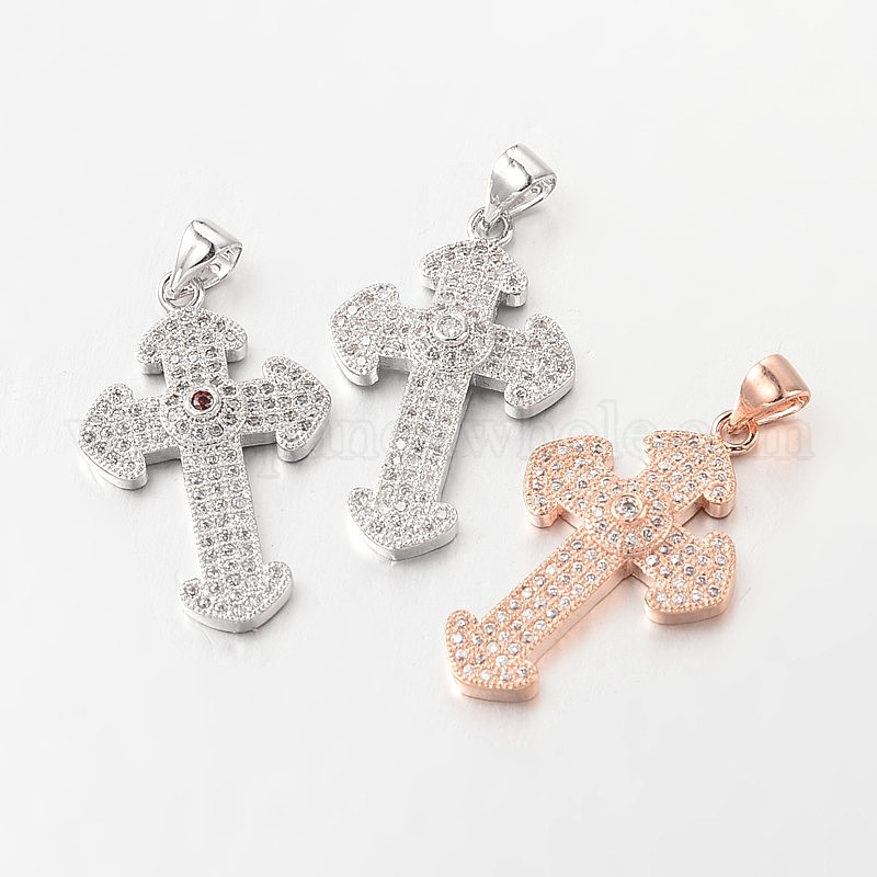 Латинский крест из латуни микро проложить Цирконом подвески, без свинца и без никеля , 28x17x4 мм, отверстие : 4x3 мм
