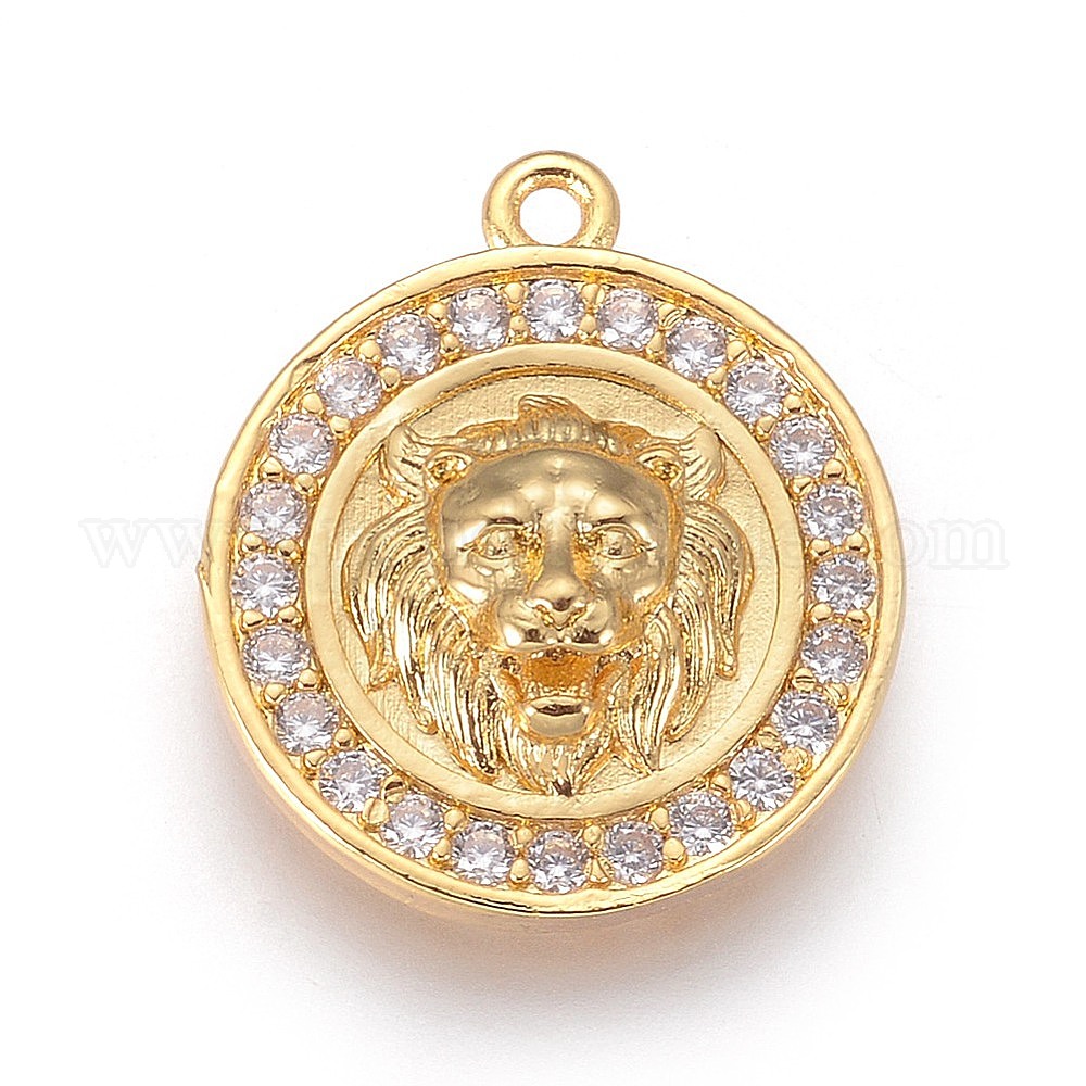 Латунные микро проложить кубического циркония подвески, долговечный, плоские круглые с головой льва, прозрачные