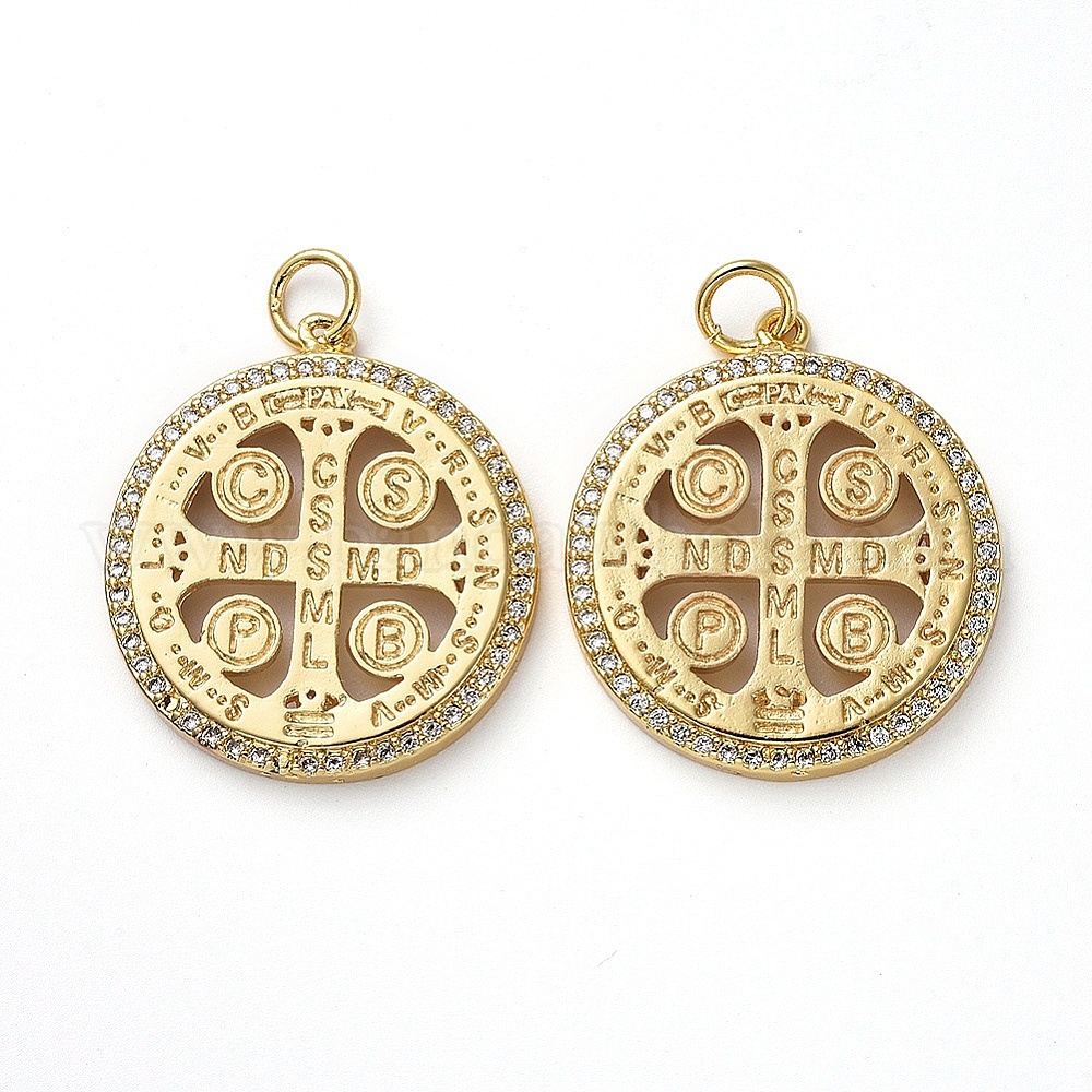 Золотой тон латунные микро проложить кубического циркония кулоны, с прыжковых колец, плоский круг с крестом и словом