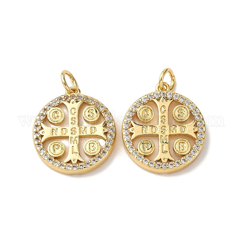Золотой тон латунные микро проложить кубического циркония кулоны, с кольцами и оболочкой, плоский круг с крестом и словом