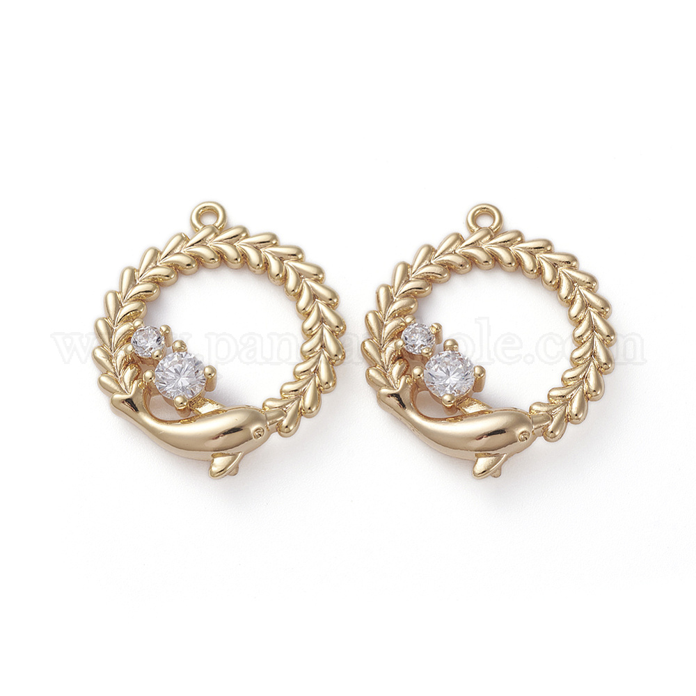 • Настоящее золото 18K Латунные микро проложить кубического циркония подвески, реальный 18 k позолоченный, кольцо с дельфином, прозрачные, 19x16x1 мм, отверстие : 1 мм