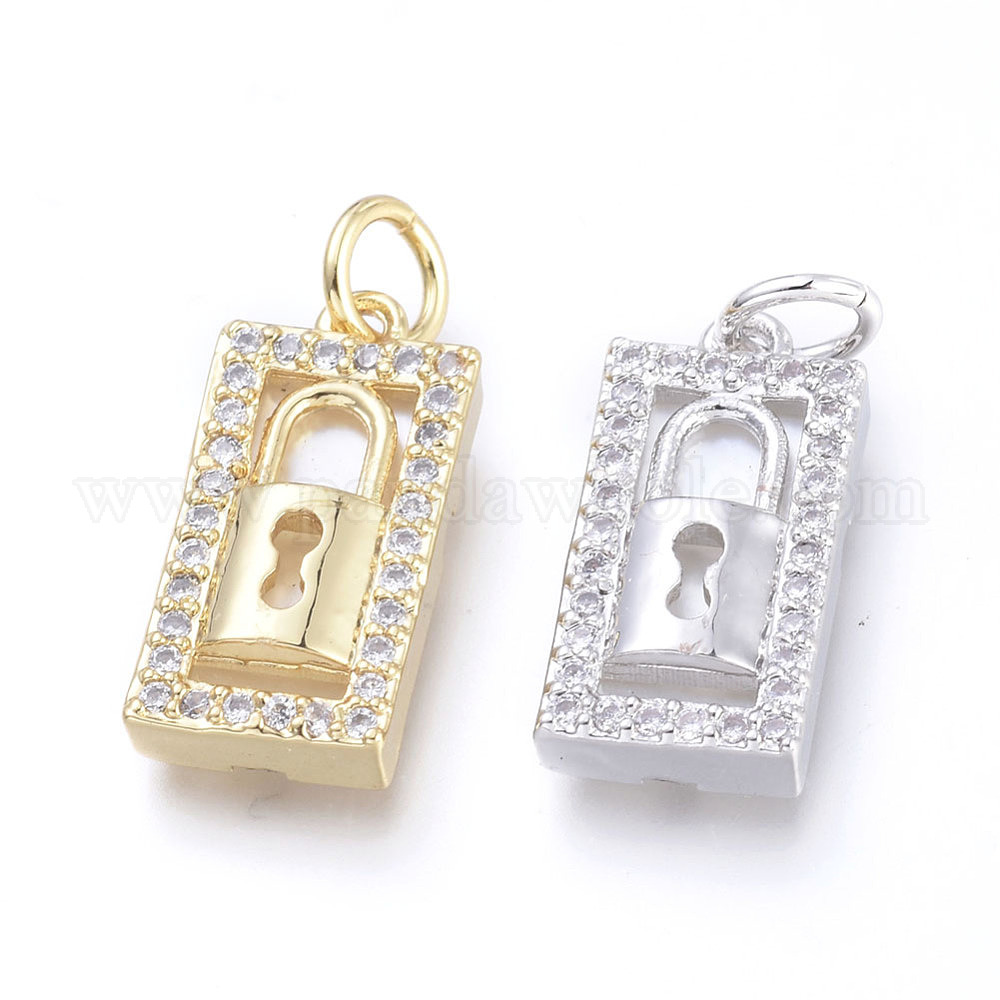 • Платина Латунные микро проложить кубического циркония подвески, с прыжковыми кольцами и натуральной оболочкой, долговечный, без кадмия и без свинца и без никеля, прямоугольник с замком, прозрачные, платина, 16x8x3 мм, отверстие : 3.4 мм