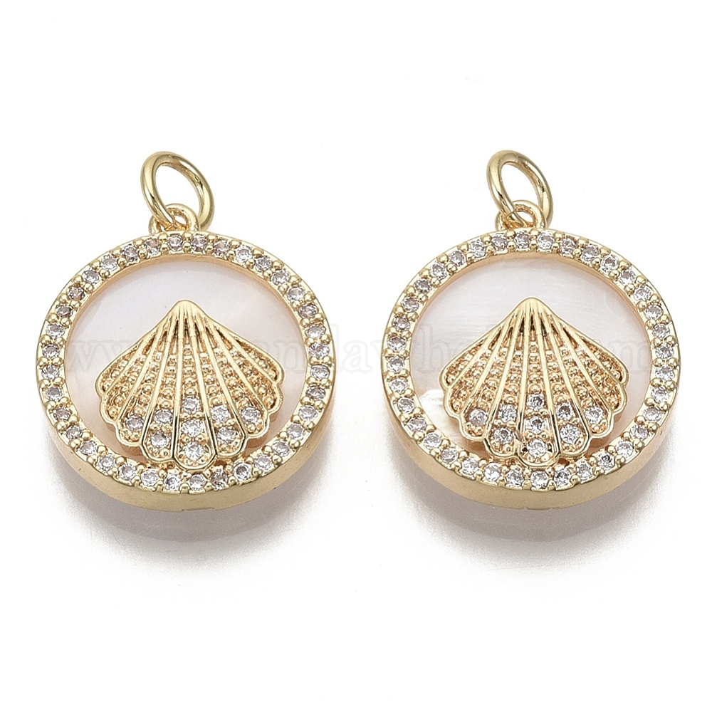 Латунные микро проложить кубического циркония подвески, с пресноводной раковиной и прыжковым кольцом, плоско-круглые, без никеля , реальный 18 k позолоченный
