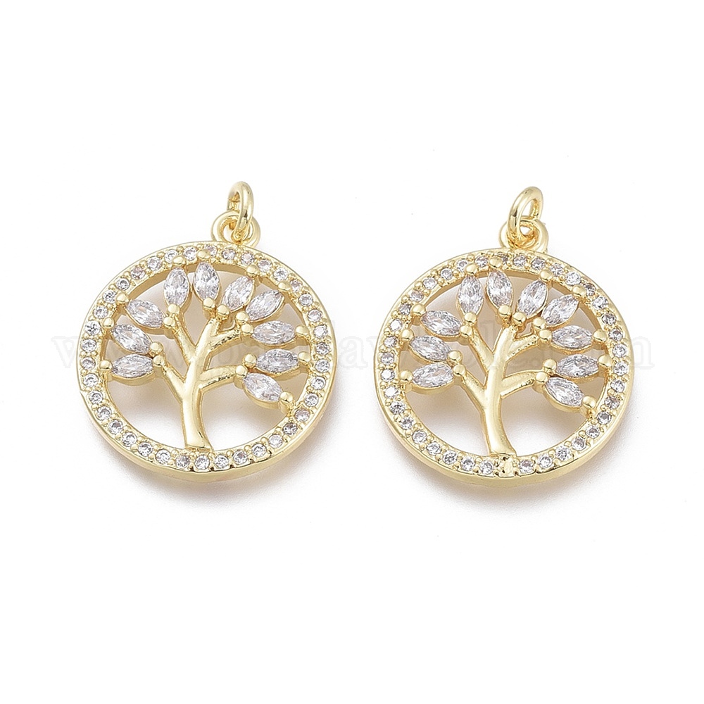 Латунные микро проложить кубического циркония подвески, с прыжковых колец, плоские круглые с деревом, прозрачные