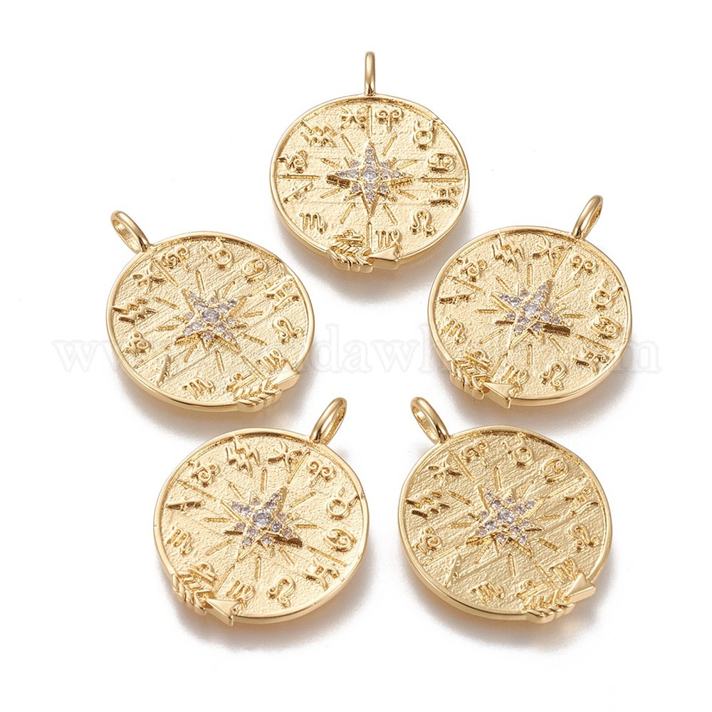 Латунные микропаве прозрачные подвески с фианитом, долговечный, плоский круглый с компасом созвездия