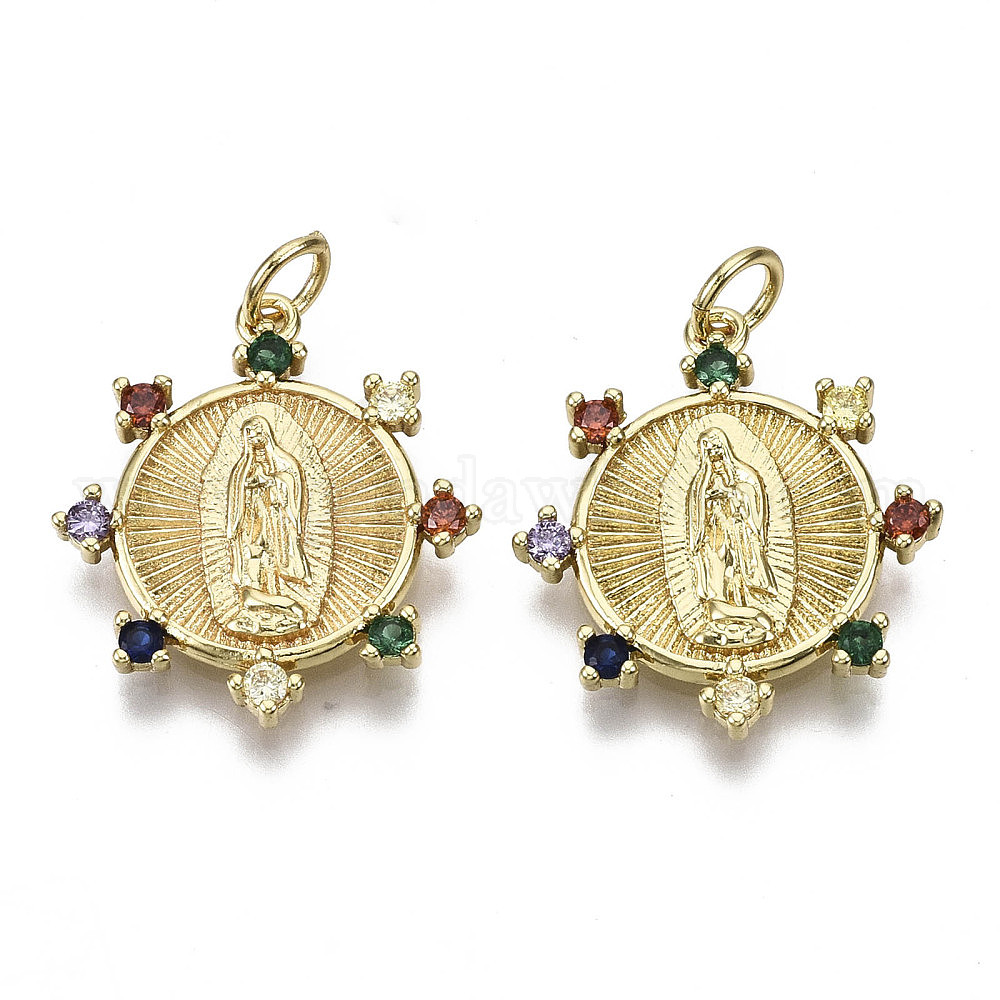 • Настоящее золото 16K Латунные микро проложить кубического циркония подвески, с целью перехода в кольце, без никеля , плоские круглые с девственницей, реальный 16 k позолоченный, 21x19x2.5 мм, Отверстие: 3 мм, кольцо прыгать: 5x1 мм, 3 мм внутренним диаметром