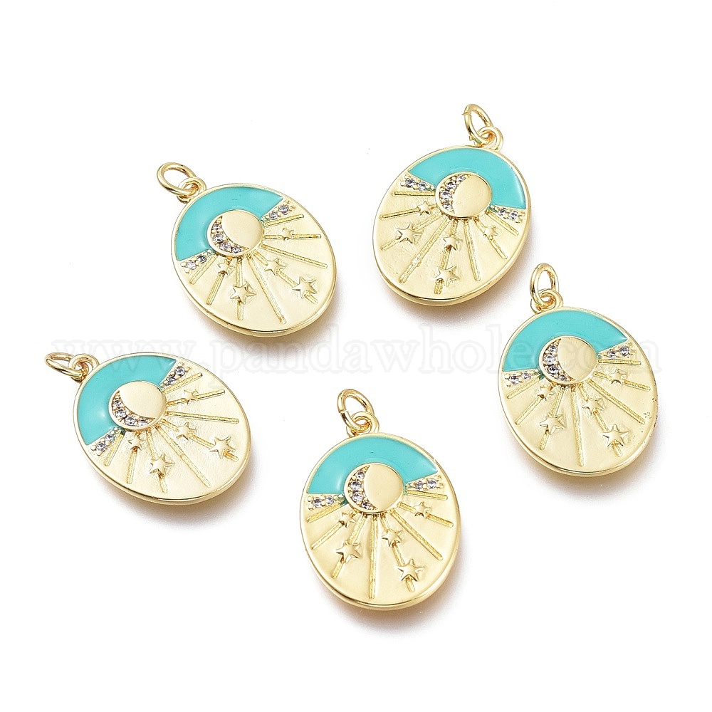 Латунные микропаве прозрачные подвески с фианитом, с эмалью и кольцами для прыжков, долговечный, овал с солнцем и звездой, голубой